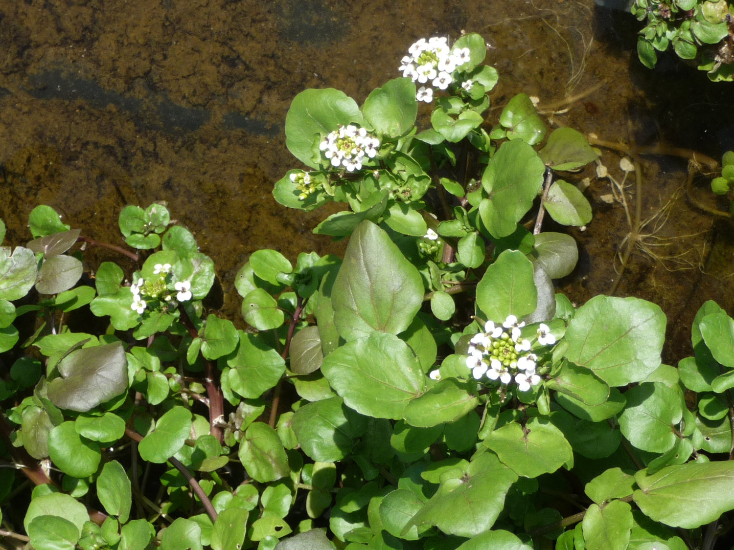 Die Brunnenkresse ist eine heimische Wasserpflanze, die wir an Bächen und Gräben finden. Für unseren Gartenteich ist sie besonders für eine Pflanzung im Bachlauf geeignet, hält sich aber auch an anderen feuchten bis nassen Plätzen. Vorne an den Triebspitzen bildet sie neue Wurzeln aus.